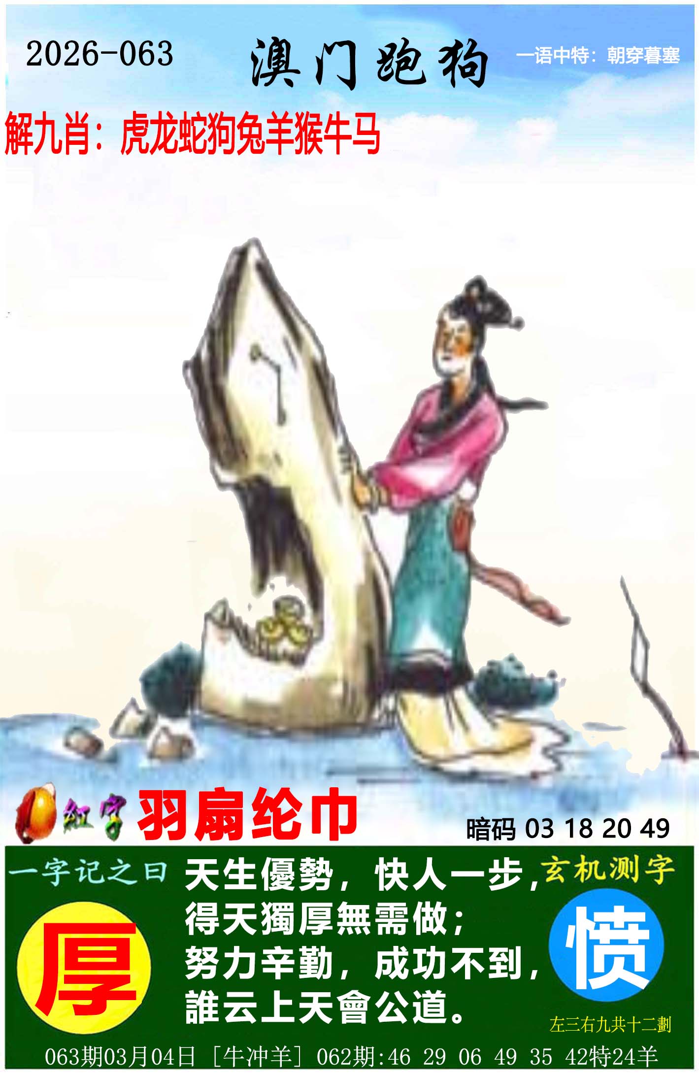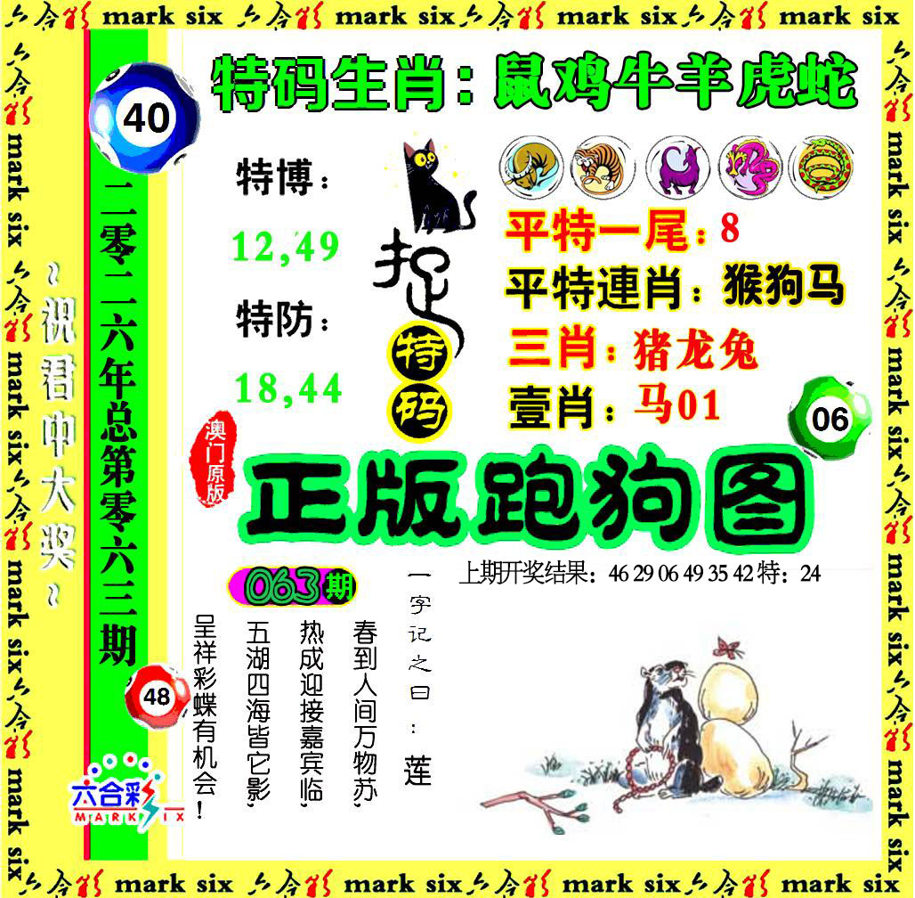 063期开奖时间2026年03月04 星期三)晚9:30开(农历正月十六 牛冲羊)063期【欲钱买狗急跳墙的生肖】